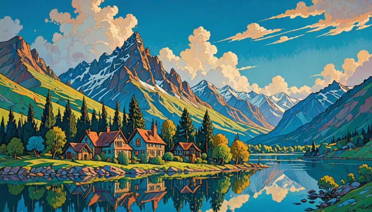 This image captures a serene lake town scene in a bright blue sky, reminiscent of classic fantasy artwork. The palette is reminiscent of a nostalgic painting style.