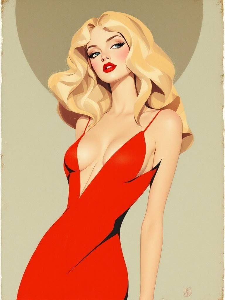 A full-body image of a blonde 1920s pin-up woman making direct eye contact. The artwork features simplified, curved forms, flat color blocking, and clean graphic definition reminiscent of Golden Age illustration.
