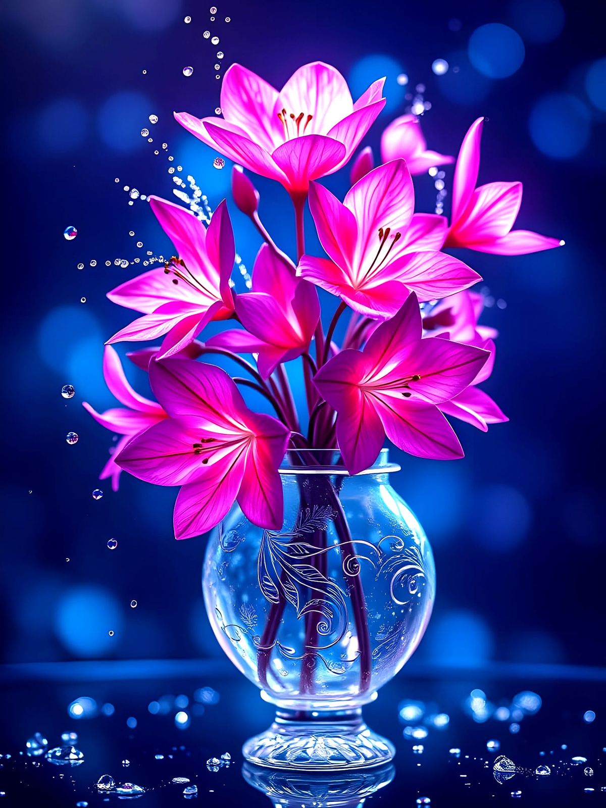 This enchanting digital painting features a glass vase overflowing with luminous, magical flowers, set against a dreamy blue bokeh background. The intricate details and vivid colors evoke a sense of wonder and fantasy.