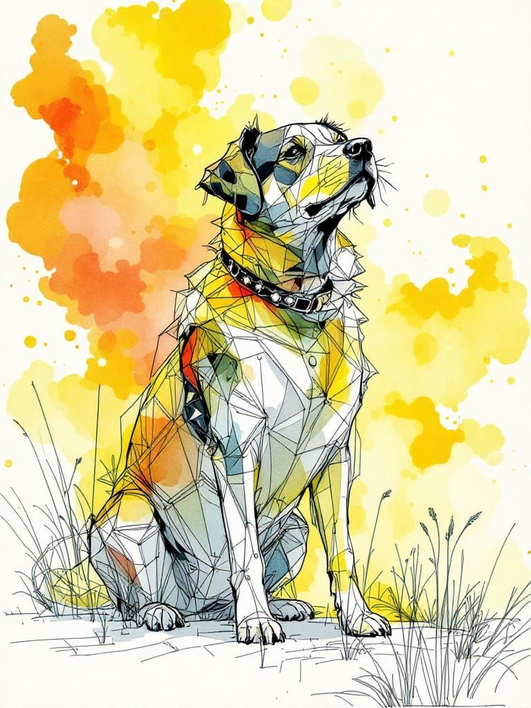 This image features a dog kneeling in sunlight, rendered with precise ink linework and atmospheric watercolor washes inspired by architectural blueprints.