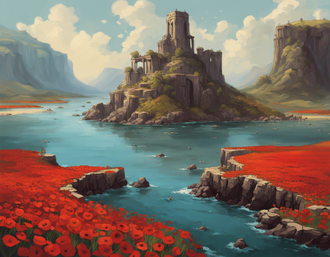 This image shows a centaur-shaped island dedicated to Ares, the Greek god of war. It features varied terrain, crimson-streaked cliffs, poppy fields, and ancient ruins, set against azure waters.