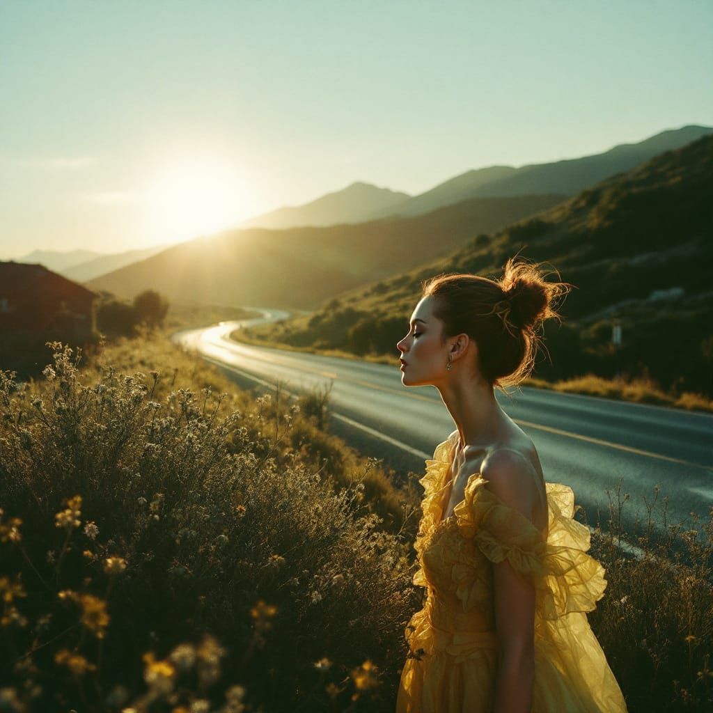 A fashion editorial image featuring a woman in a vibrant yellow dress on a highway, rendered with hyperreal saturation and dramatic lighting for a striking visual effect.