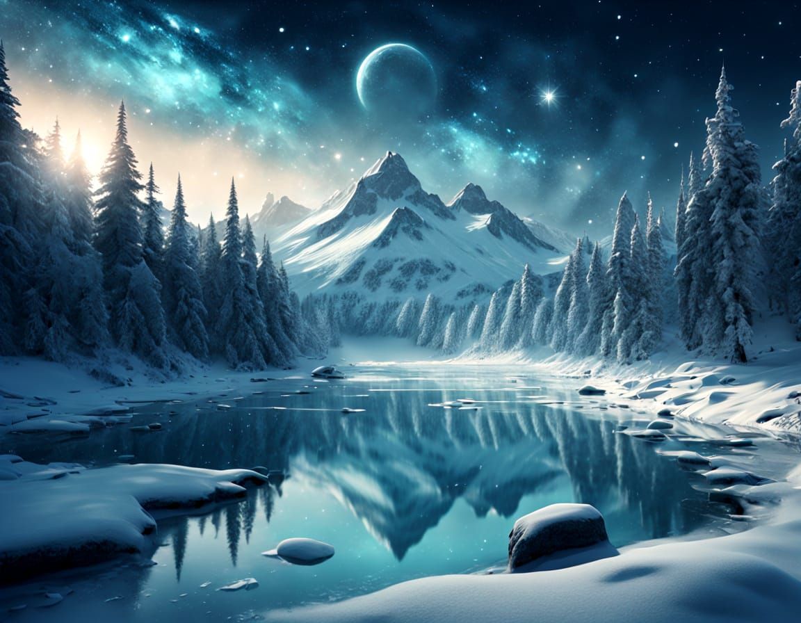 This image shows a fantasy realism winter night landscape with snow-covered mountains and forests under a cosmic sky. Luminous turquoise colors and ethereal lighting create a magical atmosphere.