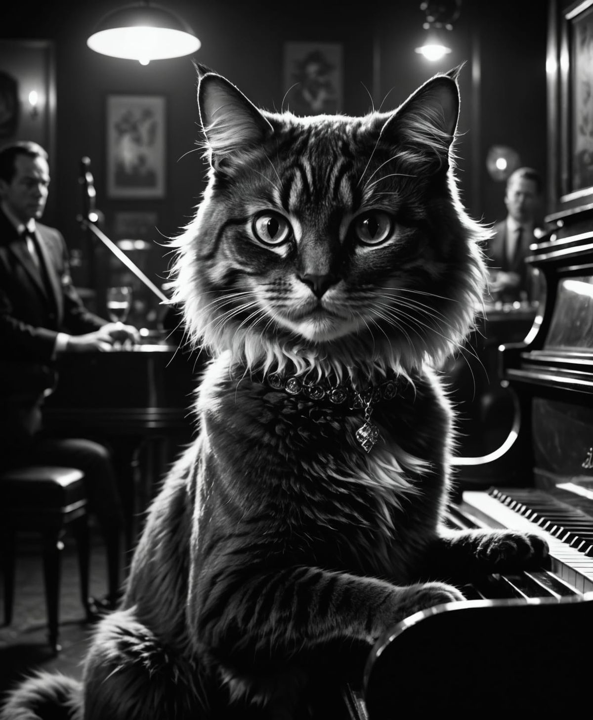 This image shows an anthropomorphic cat in a smoky jazz club. The black and white film still uses dramatic lighting and shallow focus to create a film noir aesthetic.