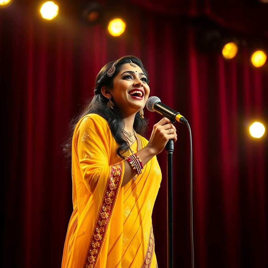 This image shows a charismatic Indian woman in a vivid yellow kameez salwar, singing on a stage with golden spotlights. The background features a crimson velvet curtain, rendered with deep saturation and dynamic lighting.