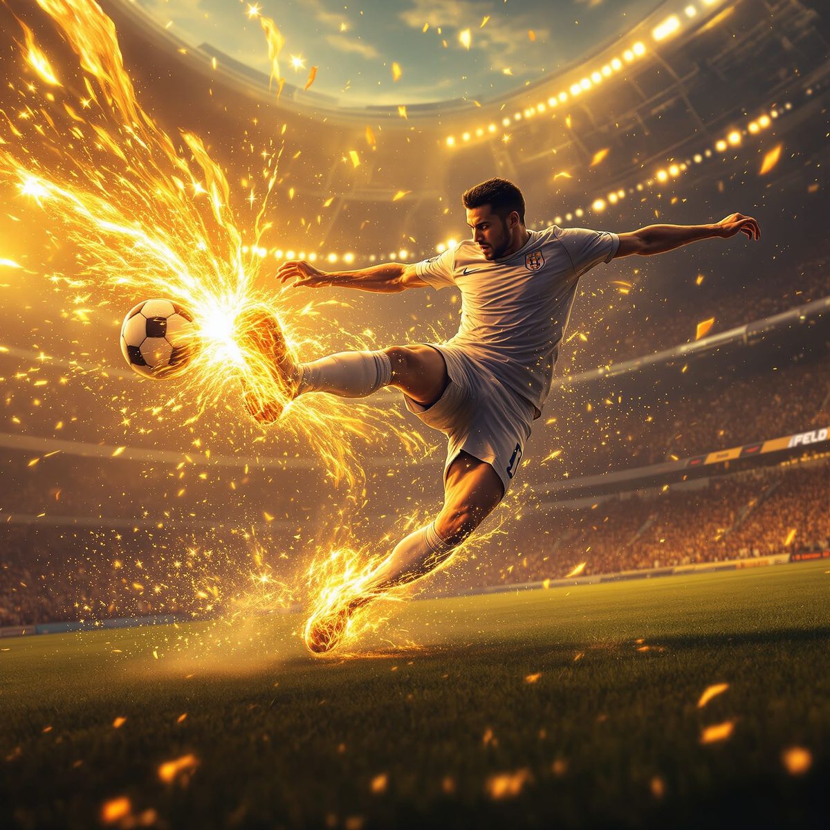 An epic sports poster capturing a soccer player's dynamic kick, unleashing a cosmic explosion of stars and fire. The scene is set in a brightly lit stadium with captivated fans.
