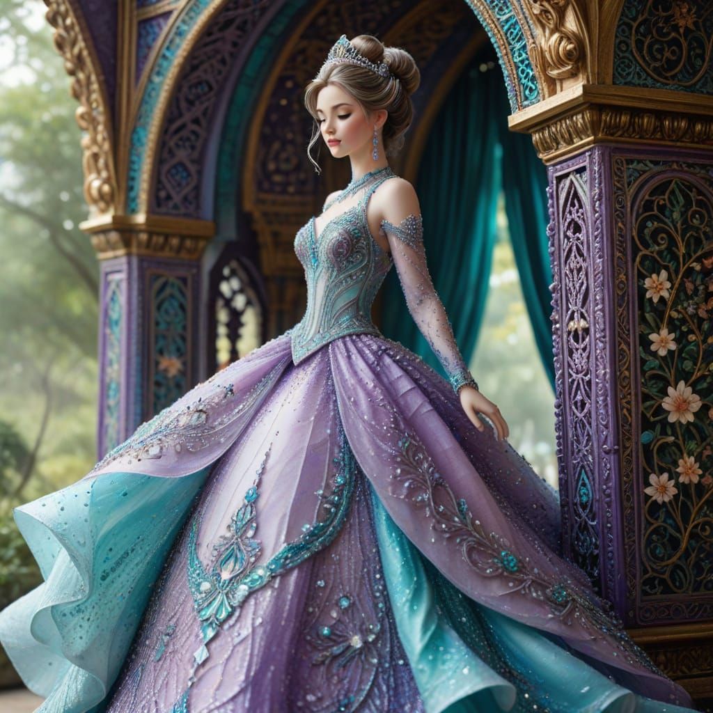 This image shows a princess in a ballgown made of diamonds and seed beads, walking through a floral archway. The watercolor style gives the macro photograph a delicate feel.
