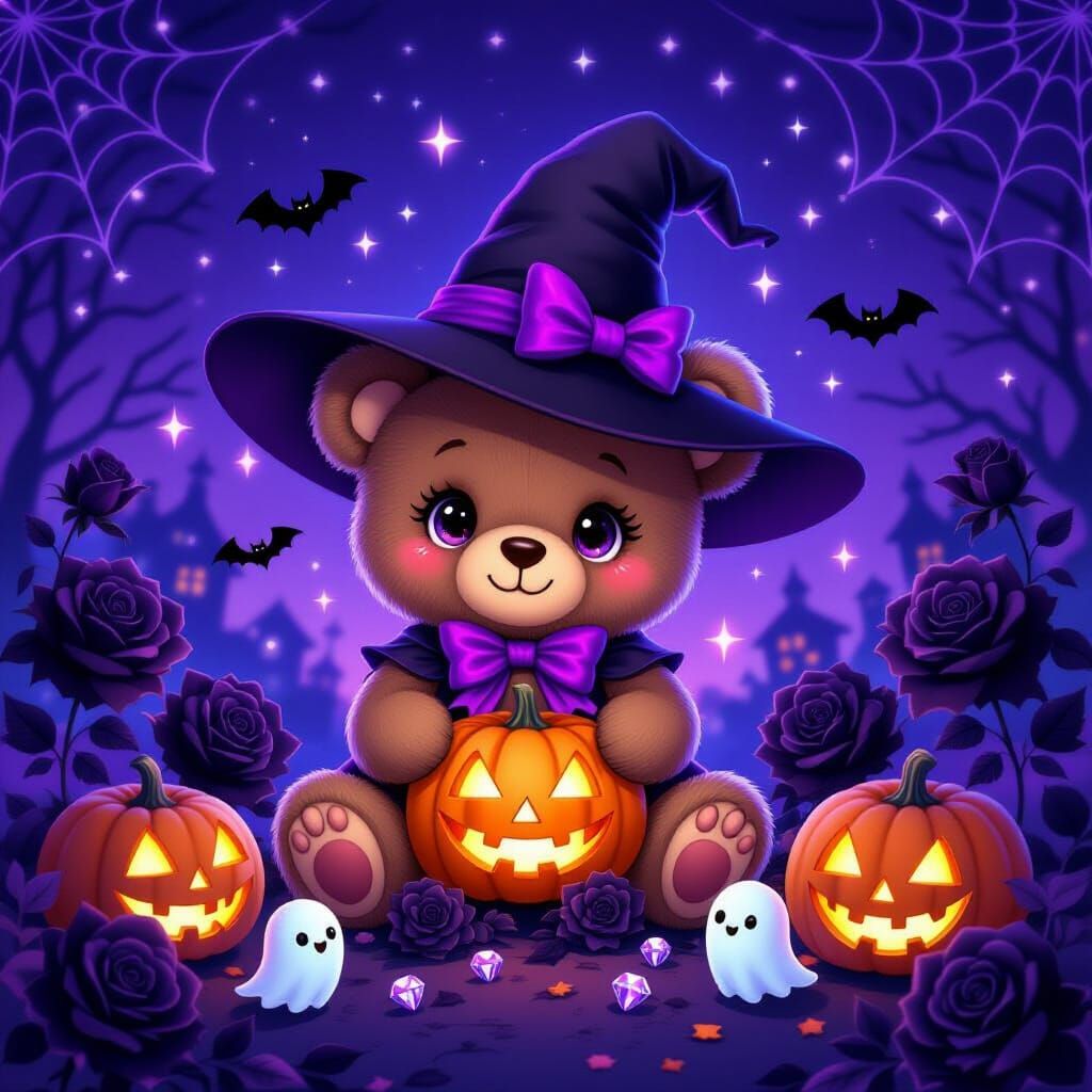 This image shows a cute brown teddy bear witch in a black hat with a purple bow, sitting among black roses and purple spiderwebs. It features glowing jack-o'-lanterns, bats, ghosts, and gemstones in a violet night sky, rendered as a detailed fantasy kawaii illustration with soft shading and magical spark...