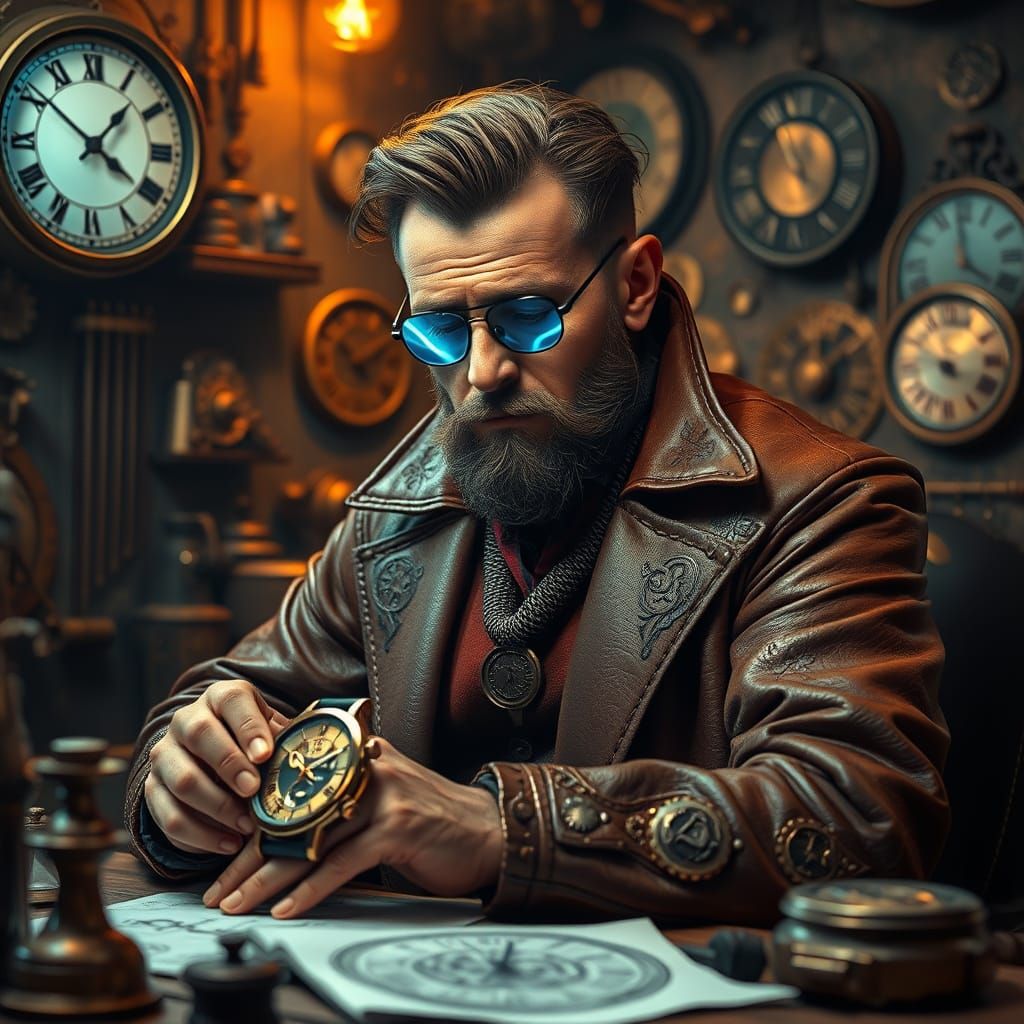 This image shows a unique steampunk clockmaker surrounded by intricate golden gears floating in mid-air. His face is a blend of human and mechanical features, with a cybernetic eye emitting a bright blue light that casts dancing shadows on the walls. He wears a worn leather cloak adorned with ancient sym...