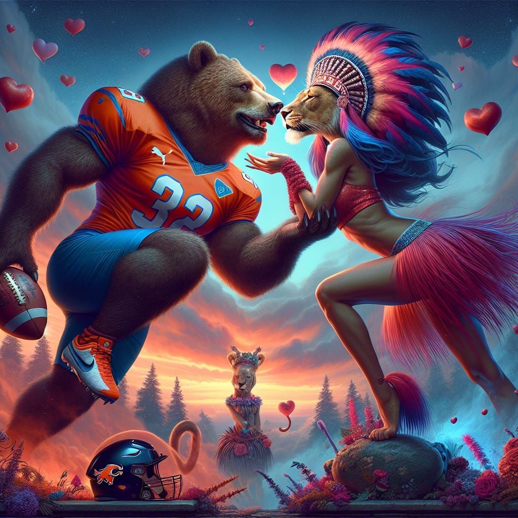 This enchanting image depicts a romantic Valentine's Day scene in a fantastical world where a football-playing bear and a hula-costumed lion share a passionate kiss, surrounded by a vibrant, detailed backdrop that transitions from day to night.