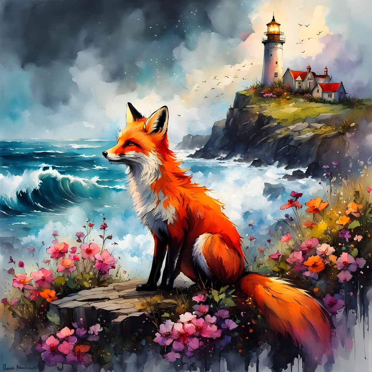 This image shows a majestic fox sitting on a rock surrounded by vibrant flowers, with a distant lighthouse and seagulls in the sky, set against a dramatic backdrop of wild ocean spray and cloudy skies with dynamic lighting, reminiscent of fantasy concept art.