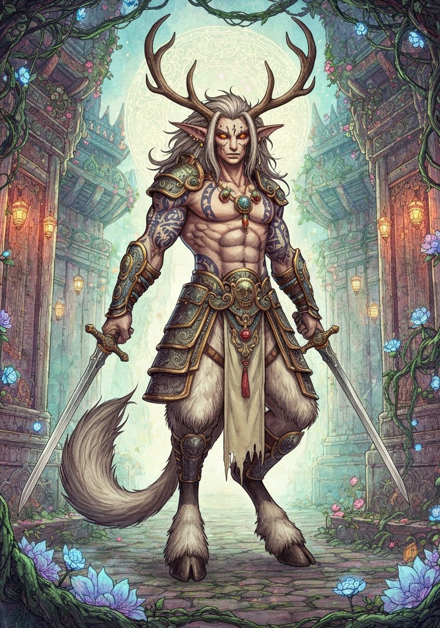 This image features a handsome, muscular fantasy hybrid creature with antlers, hooves, and tribal tattoos, adorned in mystical armor. Rendered in a detailed watercolor and ink style with golden pointillism.