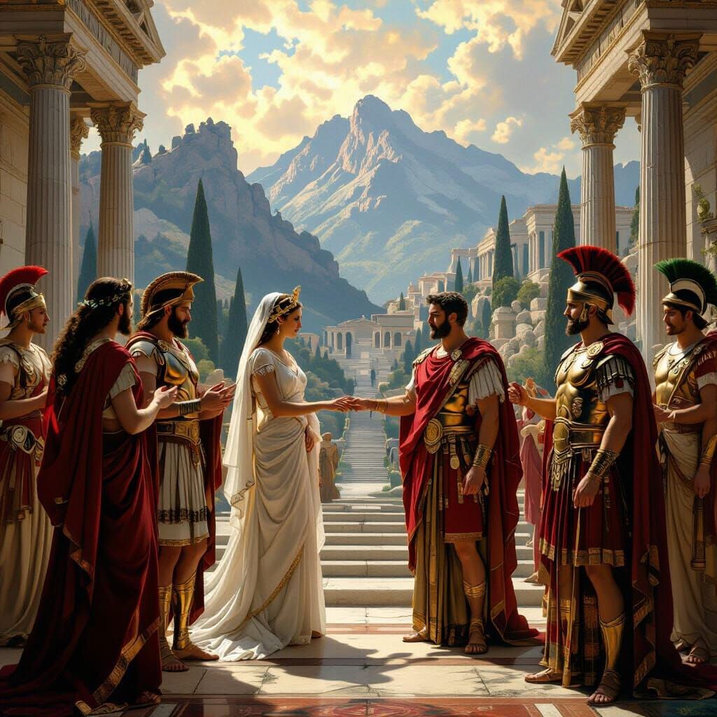 This image shows a grand mythological wedding ceremony between Greek and Roman gods amidst Mount Olympus and Roman ruins. The scene is rendered with dramatic lighting and vibrant colors in a classical painting style.