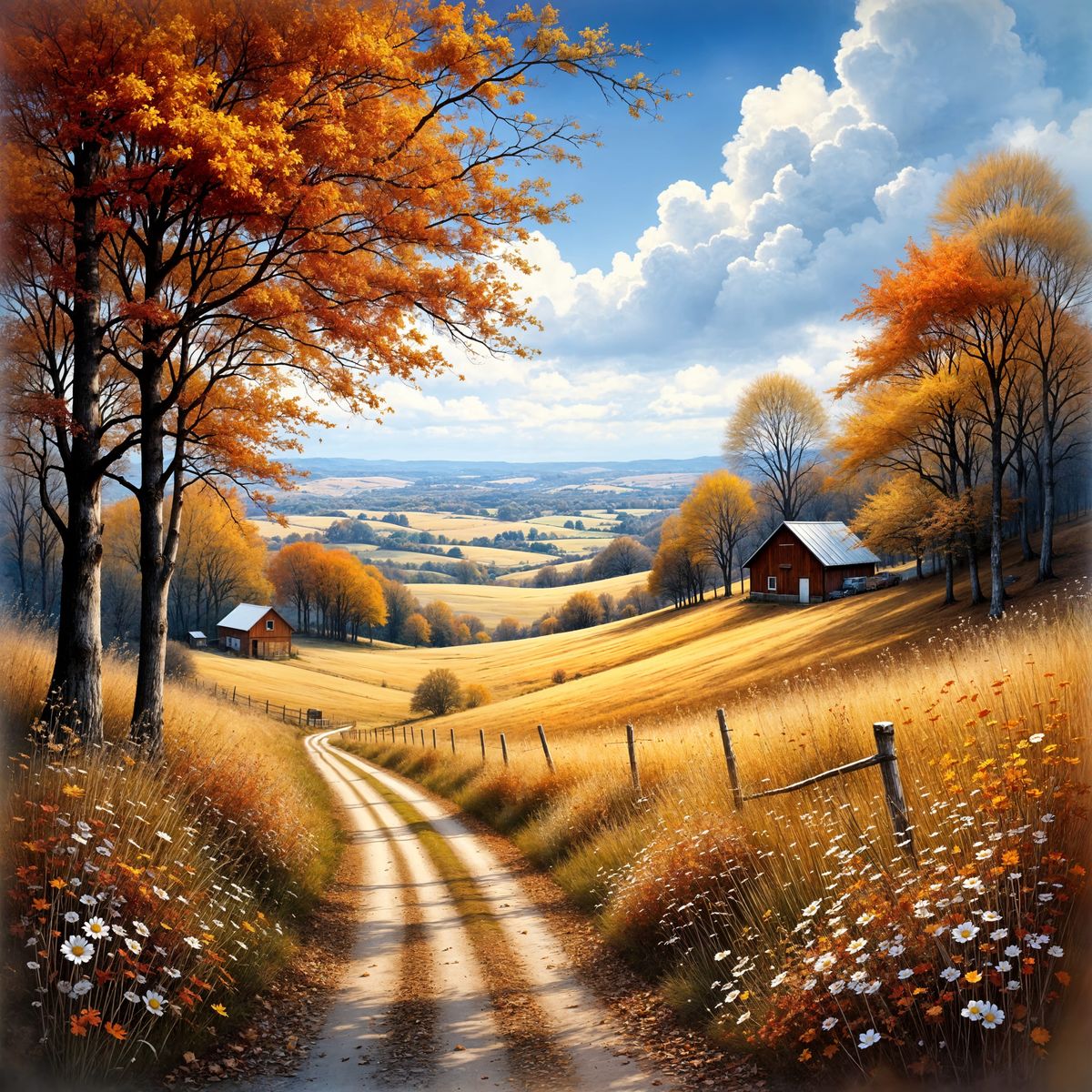 A beautiful rural landscape in Georgia during peak fall foliage. Golden fields and country roads are adorned with fall flowers under a clear blue sky.