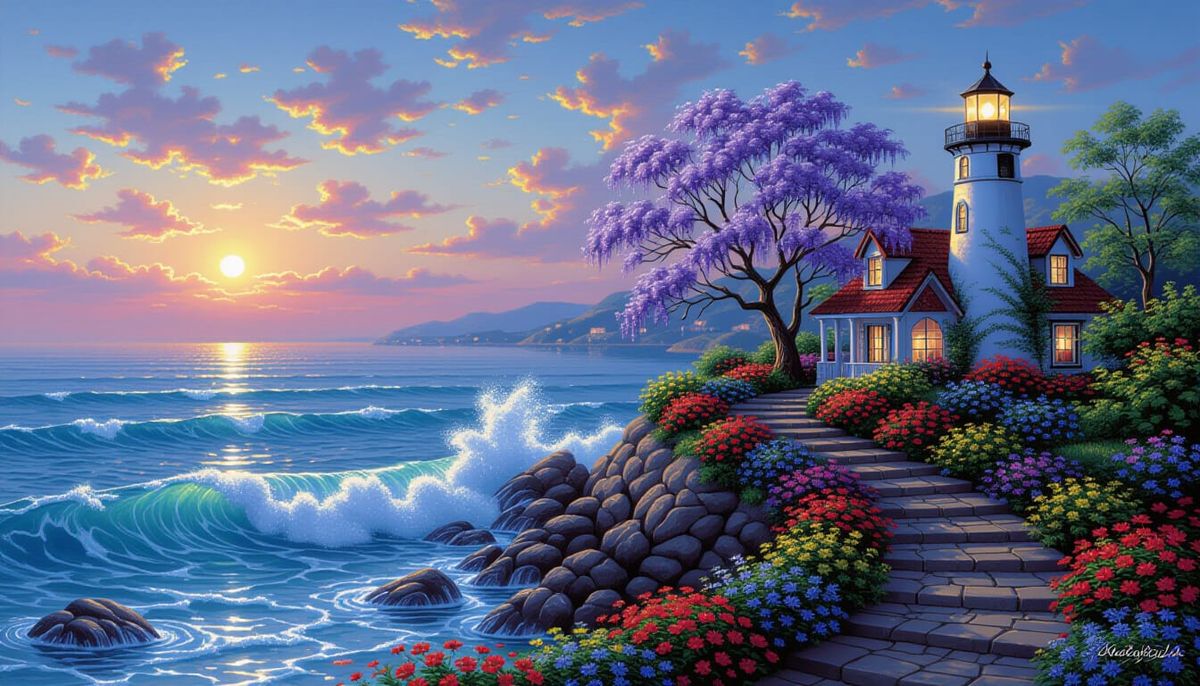 A vibrant digital artwork showcasing a luminous garden haven at night. The scene features colorful flowers, a majestic waterfall, and a quaint lighthouse, all rendered in a vivid, ultrarealistic style.