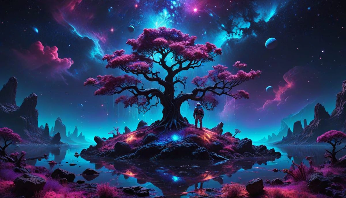 This image showcases a surreal cosmic landscape with vibrant blue galaxies, dreamy purple and pink nebula, and glowing neon leaves on floating crystalline islands, each topped with a single radiant tree, inspired by the hyperrealistic style of surrealist masters.