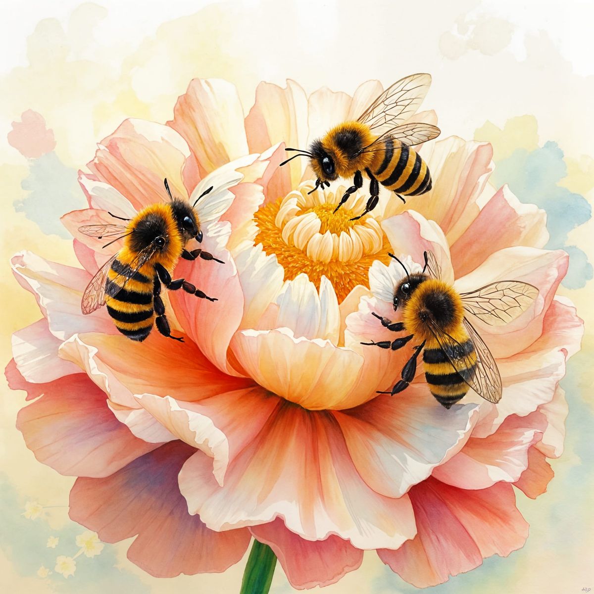 This image depicts three bees in a delicate dance around a vibrant flower in bloom, rendered in bright, detailed watercolors