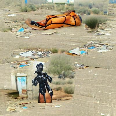 This image depicts a desolate desert landscape featuring an abandoned gimp suit. The stark contrast creates a surreal and unsettling atmosphere.