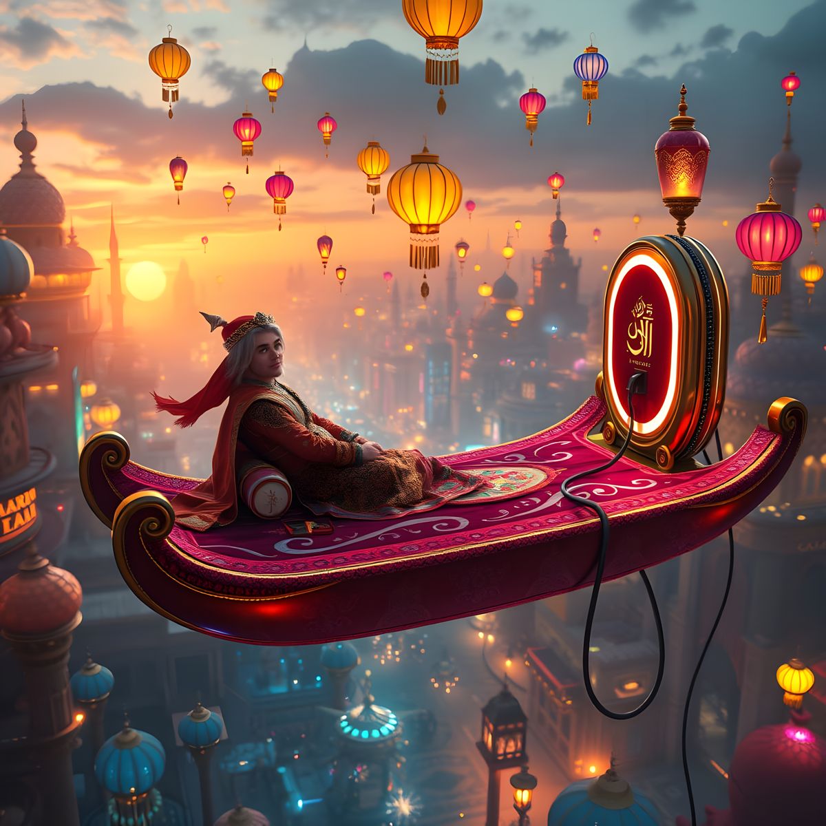 This vibrant, 8k artwork depicts Aladdin's majestic EV flying carpet charging in a fantastical cityscape at dusk, with intricate details, deep colors, and sparkling lanterns, blending photorealism and fantasy in a breathtaking piece of concept art.