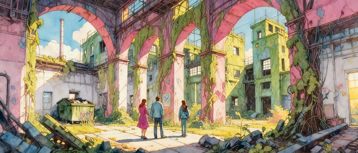 This image showcases an abandoned factory in an industrial wasteland, rendered in a watercolor comic book style with gouache accents. It features graffiti, debris, and vines, illuminated by bright, cheerful afternoon sunlight.