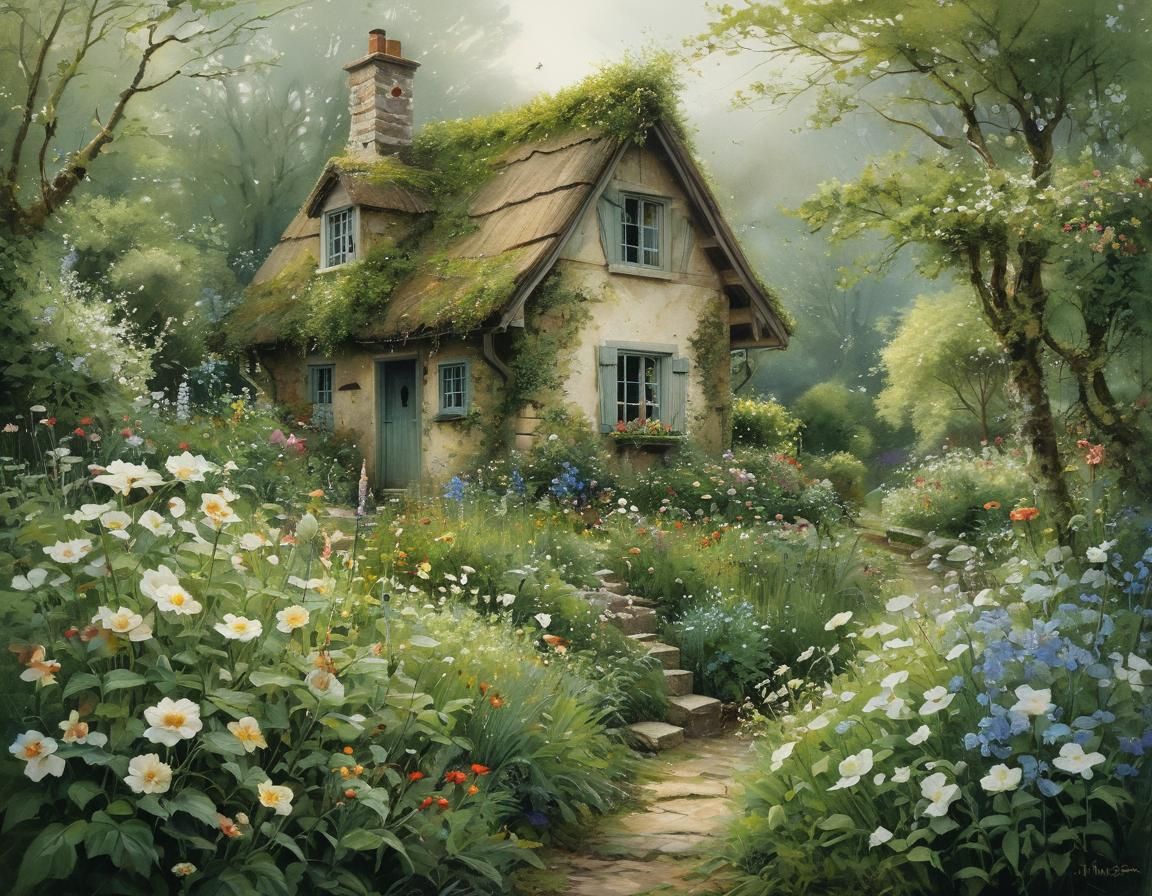 Easily design your own charming cottage garden scenes with our free AI image generator, featuring birds and blooming flowers
