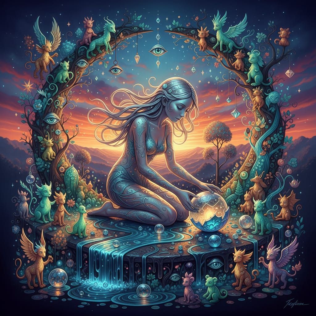 This image shows a fragmented sculpture of a woman by a sunset, picking up pieces of cracked stone balls. It blends bio art with folklore elements and intricate designs, reflecting strength and resilience.