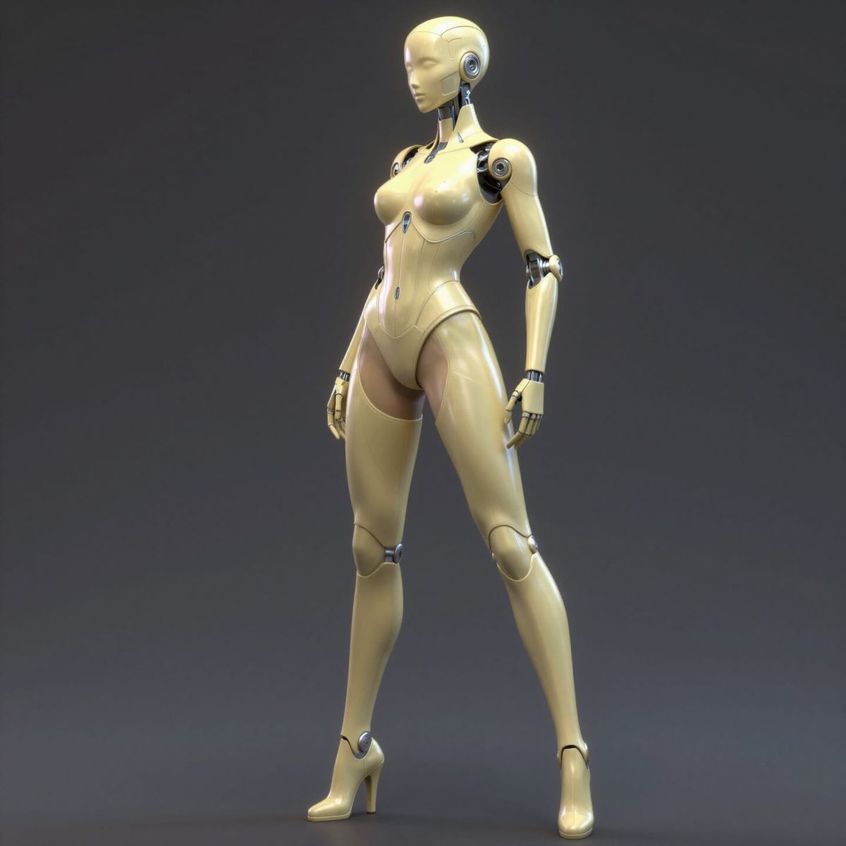 This digital matte painting showcases a full-body profile of a female robot in pale blonde exoskeleton armor. The art style blends futuristic concept art with subtle backlighting and neon accents.