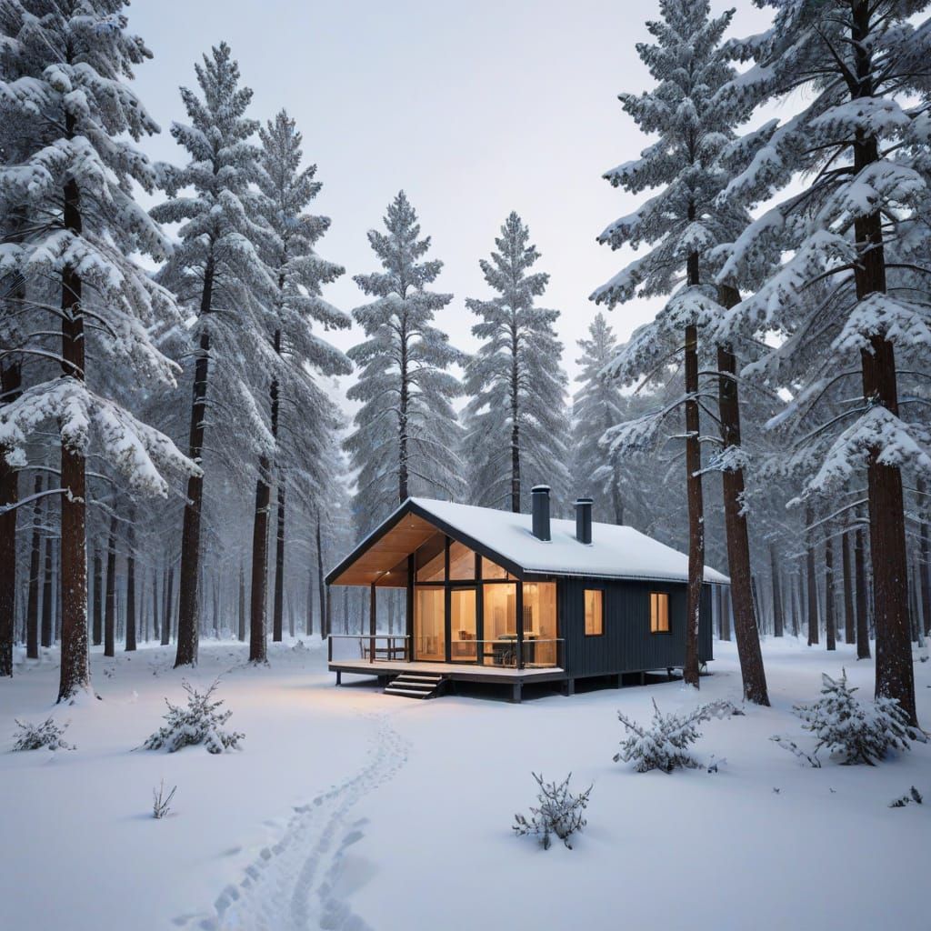 A tranquil winter scene with a glass cabin among snow-laden pines. Warm light spills from the cabin, set against a minimalist backdrop of falling snow and stark beauty.
