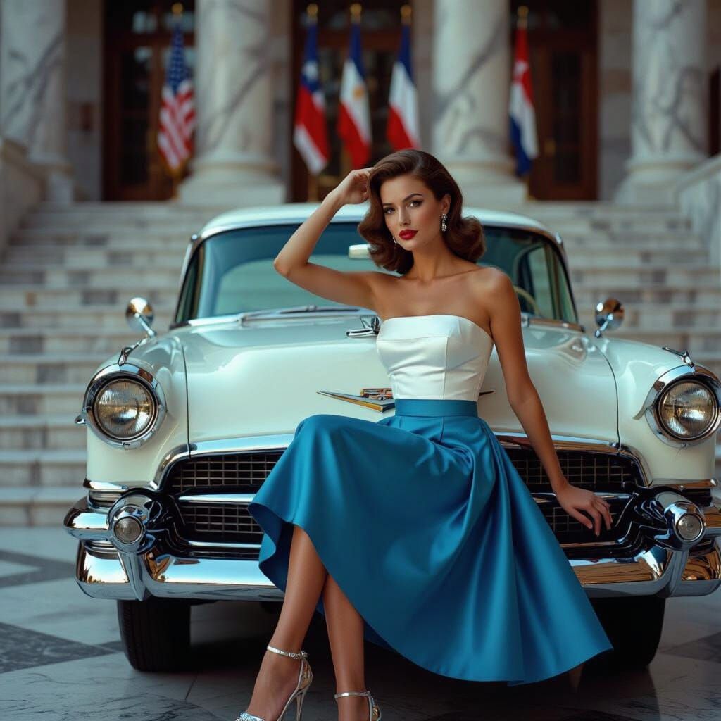A confident woman in a white satin top and steel blue skirt poses by a 1955 Chrysler Imperial. The image features cinematic lighting and a nostalgic film grain, evoking a 1950s reception atmosphere.