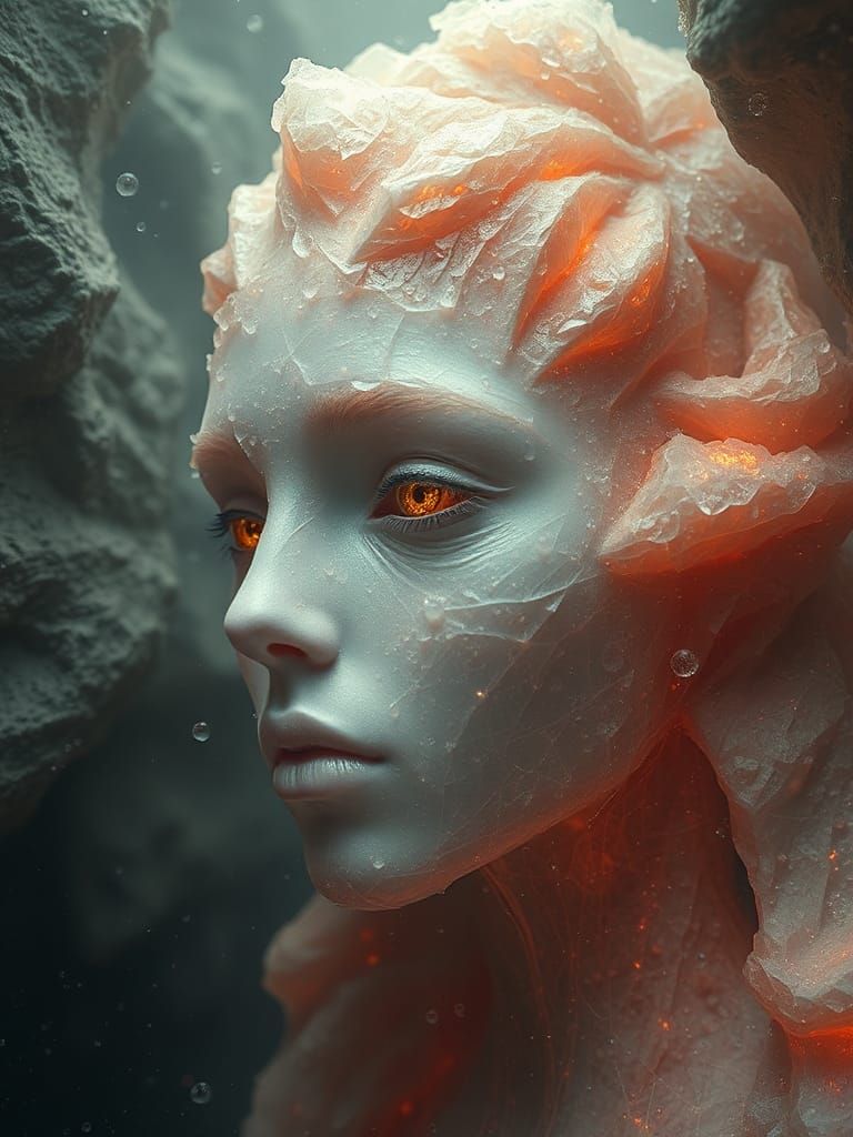 A surreal image of spectral creatures in a multiverse. The beings have synthetic skin, turquoise features and golden eyes, reflecting an ethereal, haunting beauty.