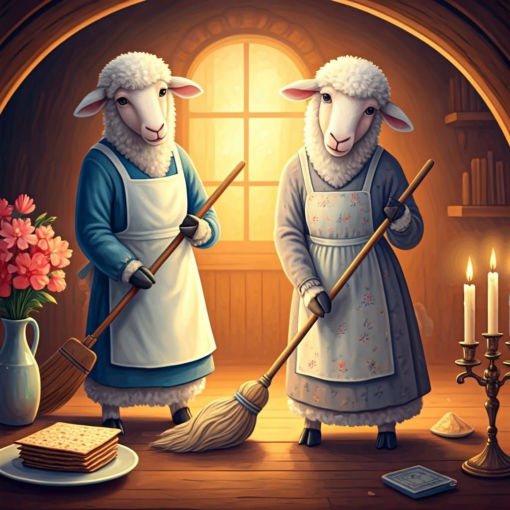 This charming image depicts a pair of anthropomorphic sheep in folk-art style, busily cleaning a warm and inviting house for Passover. One sheep holds a small broom, while the other grasps a mop, amidst a delicate vase, matzah, and ornate candlesticks.