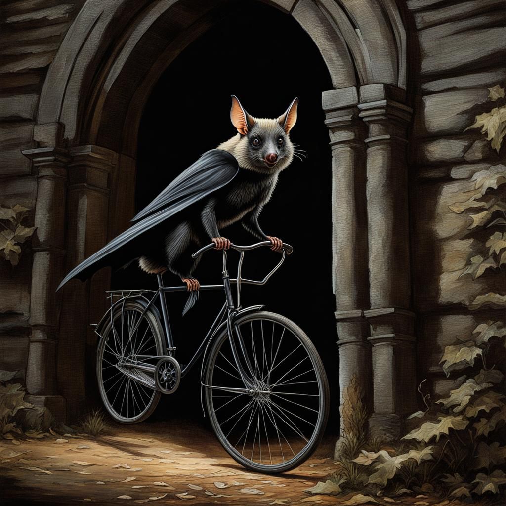 This image shows a bat riding a bicycle in front of a karst cave entrance surrounded by trees. The scene is rendered with photorealistic detail and a horror aesthetic.