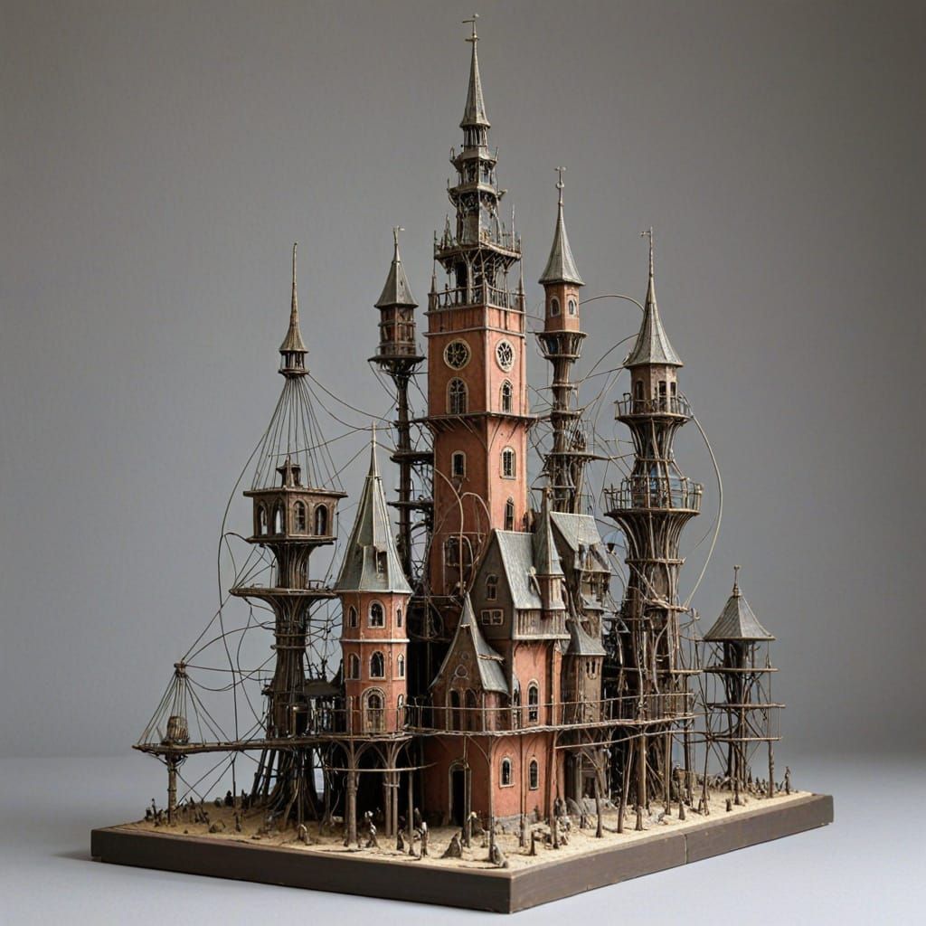 A bizarre cityscape of twisted wire sculptures. This image evokes a constructivist aesthetic with industrial materials assembled into sculptural forms, reminiscent of Bosch.