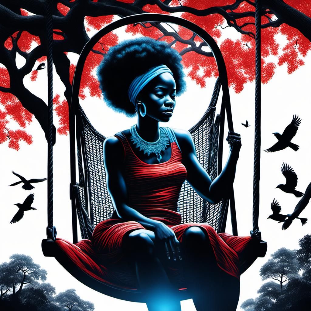 This image shows a beautiful African woman in a bioluminescent scene, seated on a swing with small red birds. The backdrop features trees, all rendered with hyperrealism.