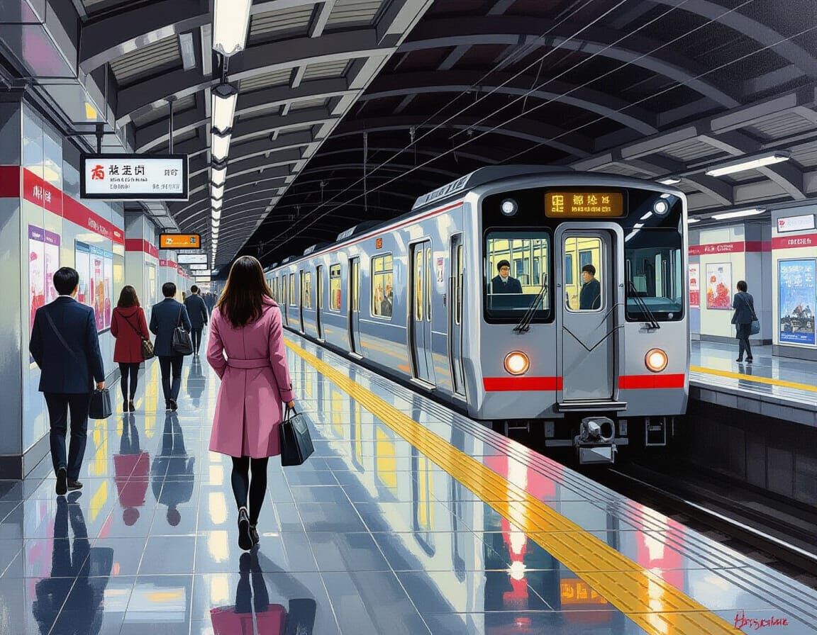 A realistic oil painting of a woman on a subway platform in Tokyo as a train arrives. The scene is rendered in muted colors with reflections and subtle lighting.
