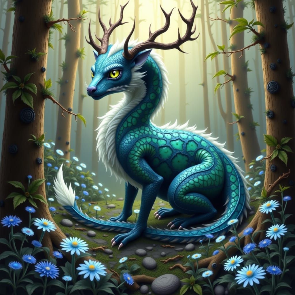 This image shows a serene dragon-cat hybrid with jade scales and antlers, seated among blue aster flowers. The creature is bathed in golden light within a winter forest, creating a dreamlike fantasy scene.