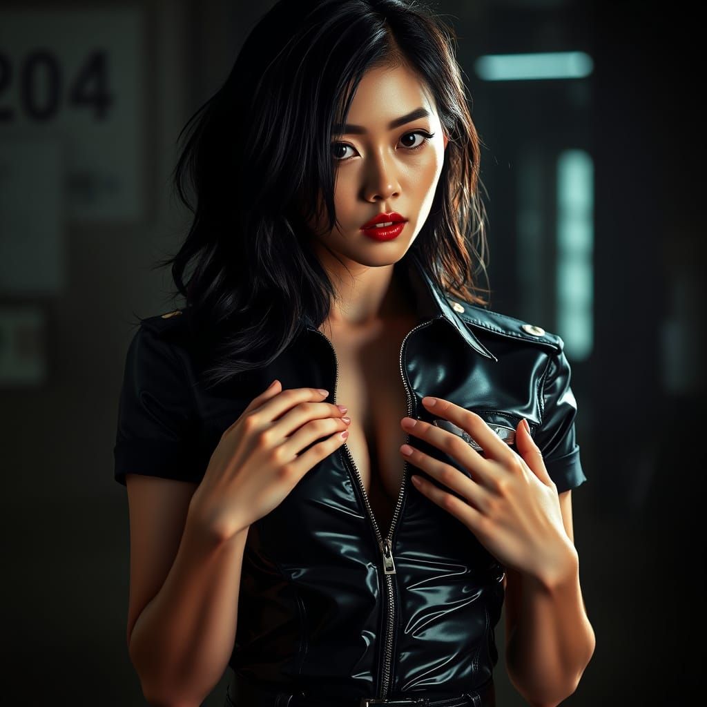 A striking picture of a dark-haired Japanese woman in a suggestive pose. She is wearing a partially unzipped police uniform, presented with dramatic lighting and bold lines in a noir aesthetic.