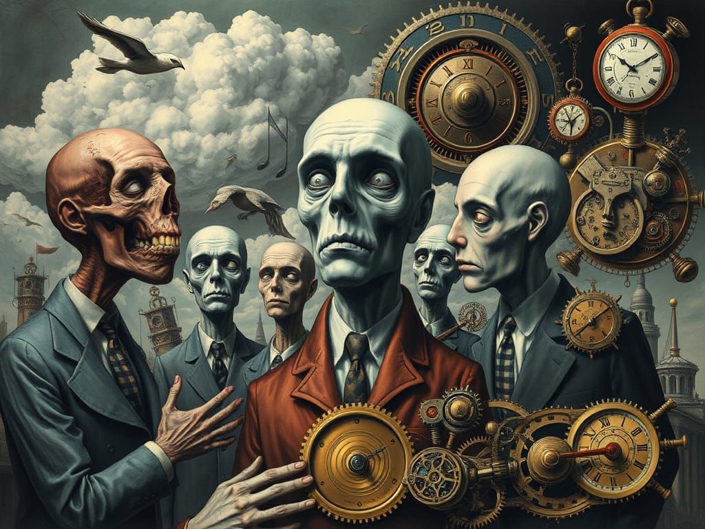 This image depicts surreal, distorted human figures in a bizarre, dreamlike setting surrounded by abstract, surreal elements, evoking the works of H.R. Giger, Zdzisław Beksiński, and Francis Bacon, with a hint of grotesque, caricatured exaggeration