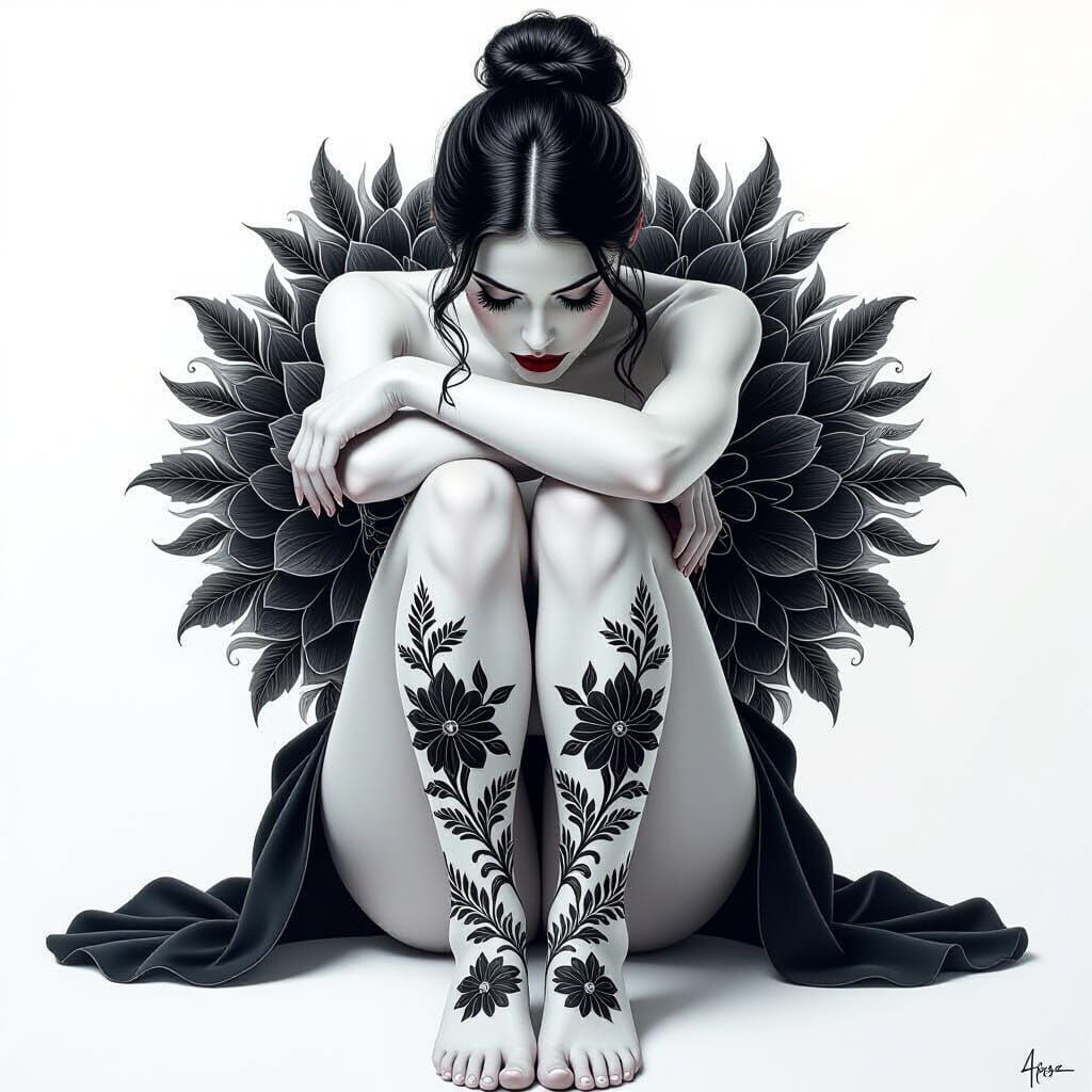 This image shows a woman with black and white floral designs on her body, sitting against a minimalist white background. The artwork evokes surrealist art with intricate details, ornate lines, and surreal flair.