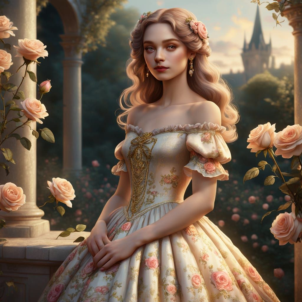 A portrait of a woman in a long, off-the-shoulder dress with delicate floral patterns, set against soft golden lighting in a whimsical fantasy art piece with a French provincial aesthetic