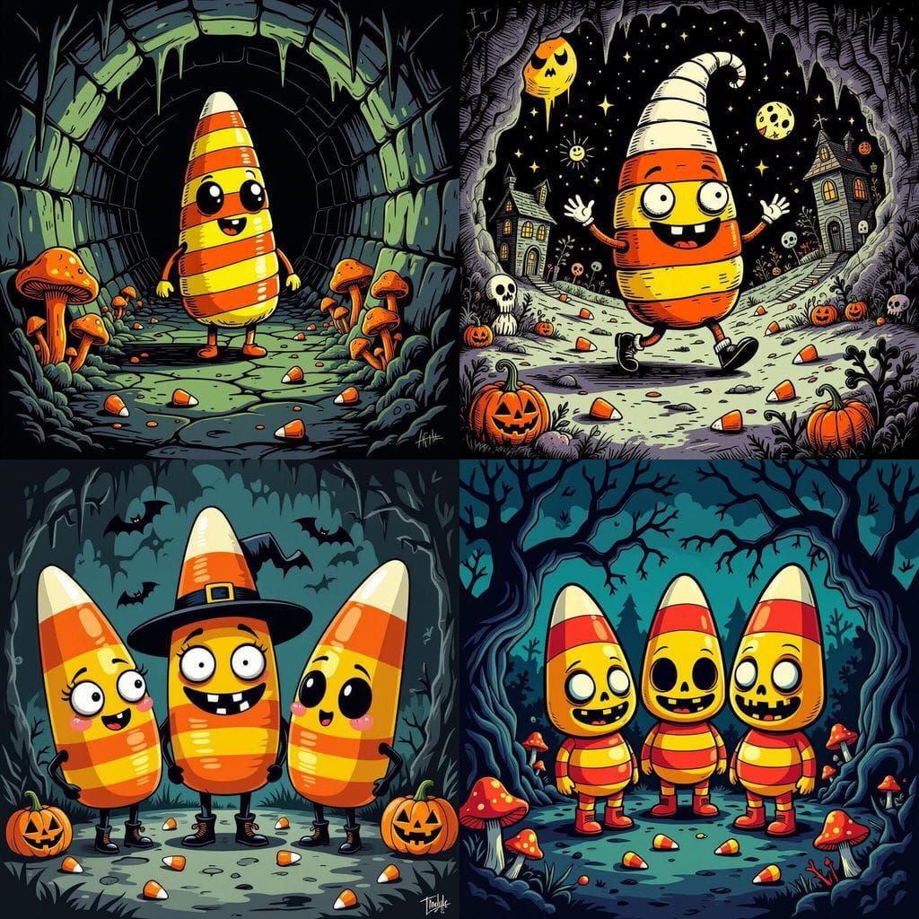 This image features a candy corn character in a style reminiscent of underground comix and Tim Burton, rendered with retro aesthetics.