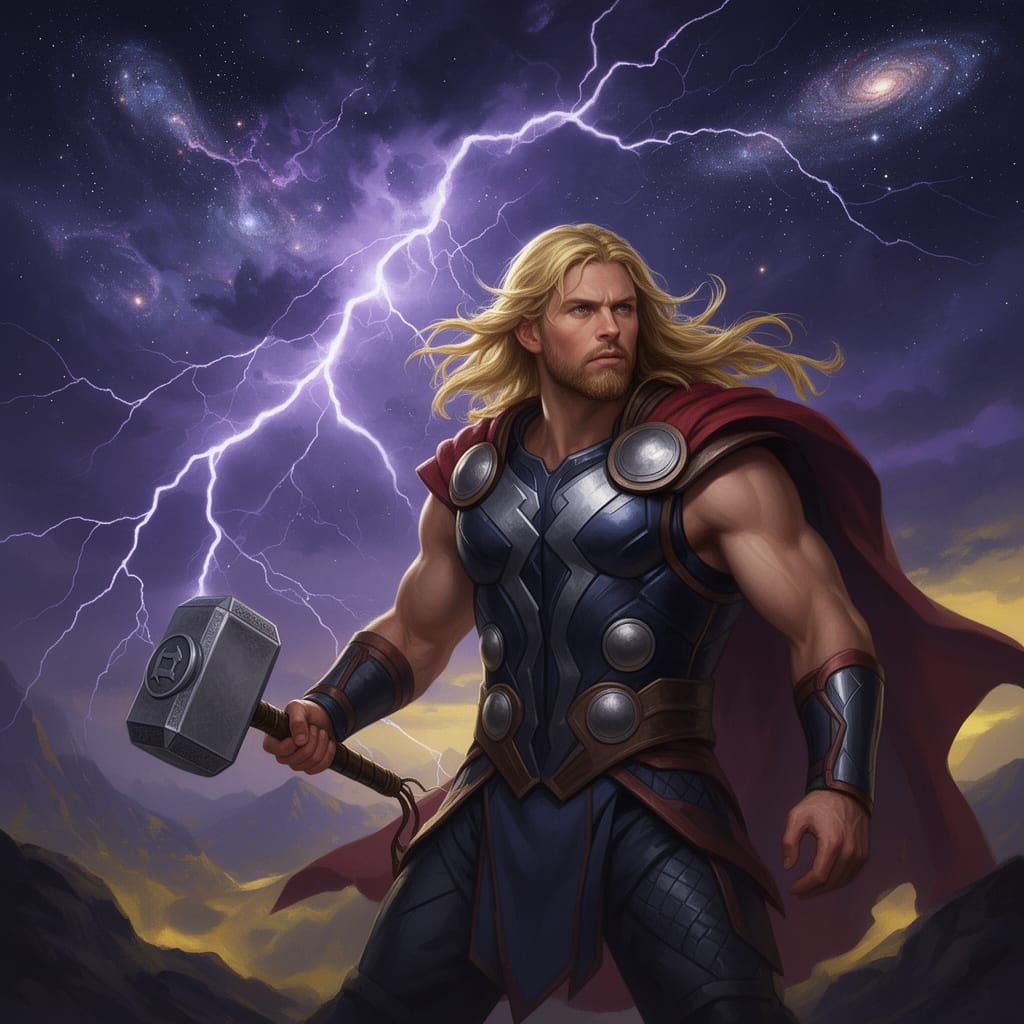 A hyperdetailed dark fantasy concept art of Thor, the Norse god, holding Mjolnir amidst a cosmic sky. Features dynamic volumetric lighting in purple and yellow.