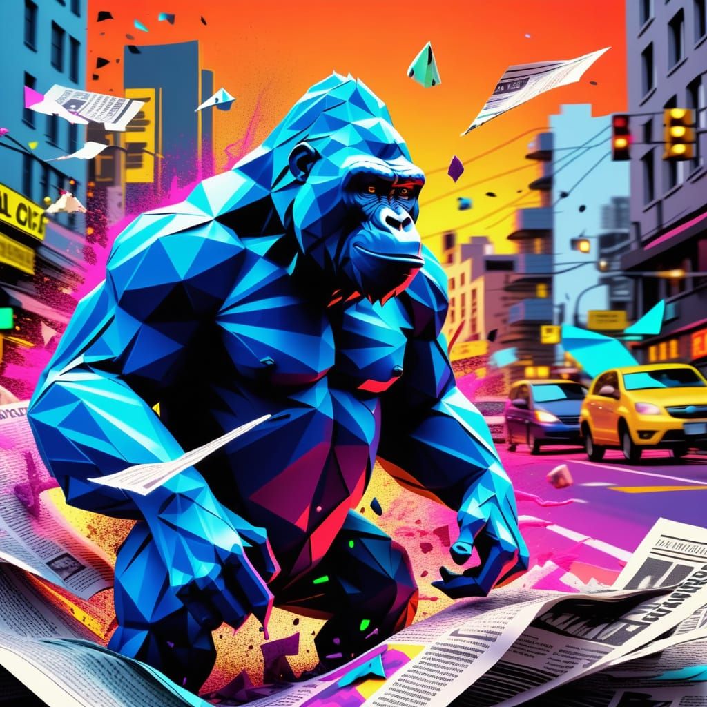 This image shows a newspaper origami gorilla wreaking havoc on a city street. The digital art features a vibrant comic book style with colorful paper scraps and ink textures, all rendered in high-resolution 4K.