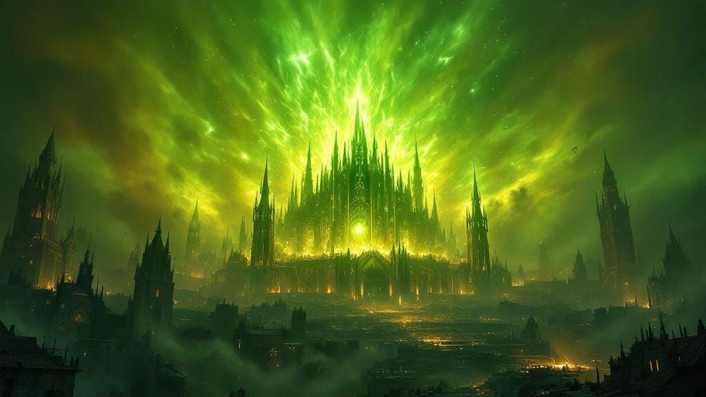 A dramatic image shows the Grand Sept of Baelor exploding in green wildfire. The surrounding gothic structures are shattered in this surreal, cinematic scene reminiscent of mystical landscapes.