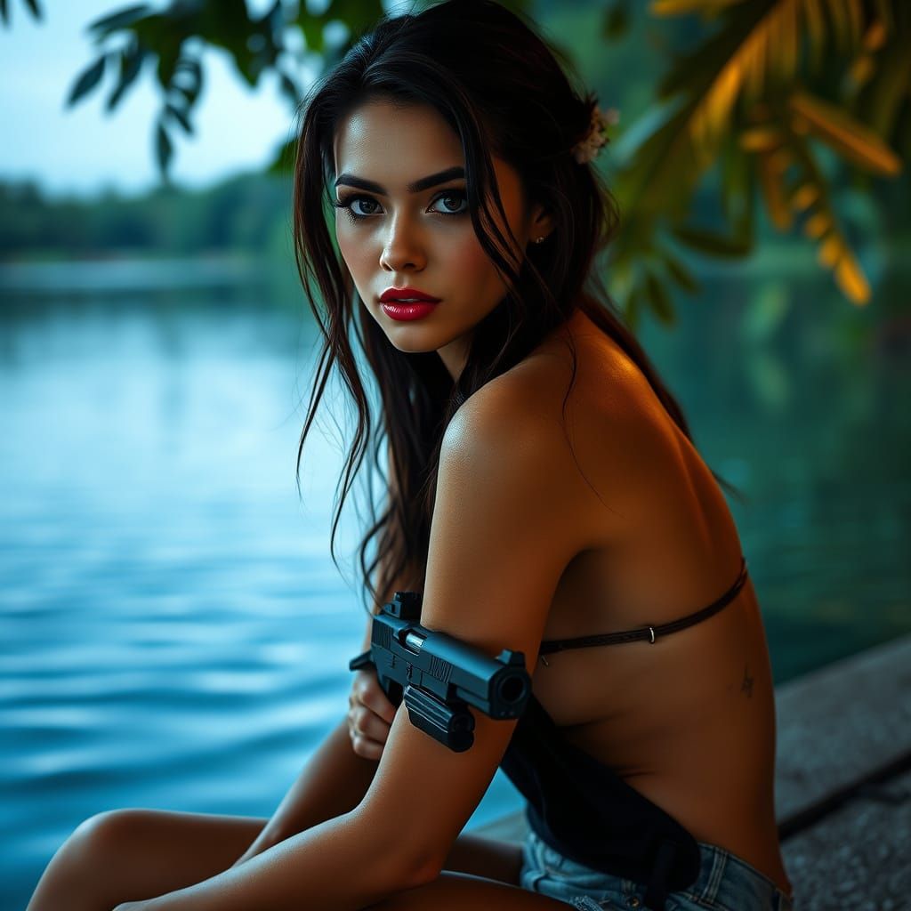 This image shows a stunning woman sitting in a serene lake, surrounded by a lush jungle backdrop, exuding power and dignity. With realistic, hyper-realistic details and cinematic lighting, the portrait is a masterpiece of photo-realistic art.