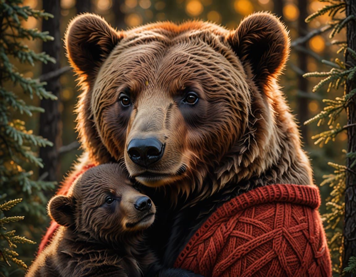 A heartwarming image of a Kodiak bear cub wrapped in a red cableknit sweater, cuddling with its mother in a soft forest setting, captured in warm, natural colors with a focus on texture and detail.