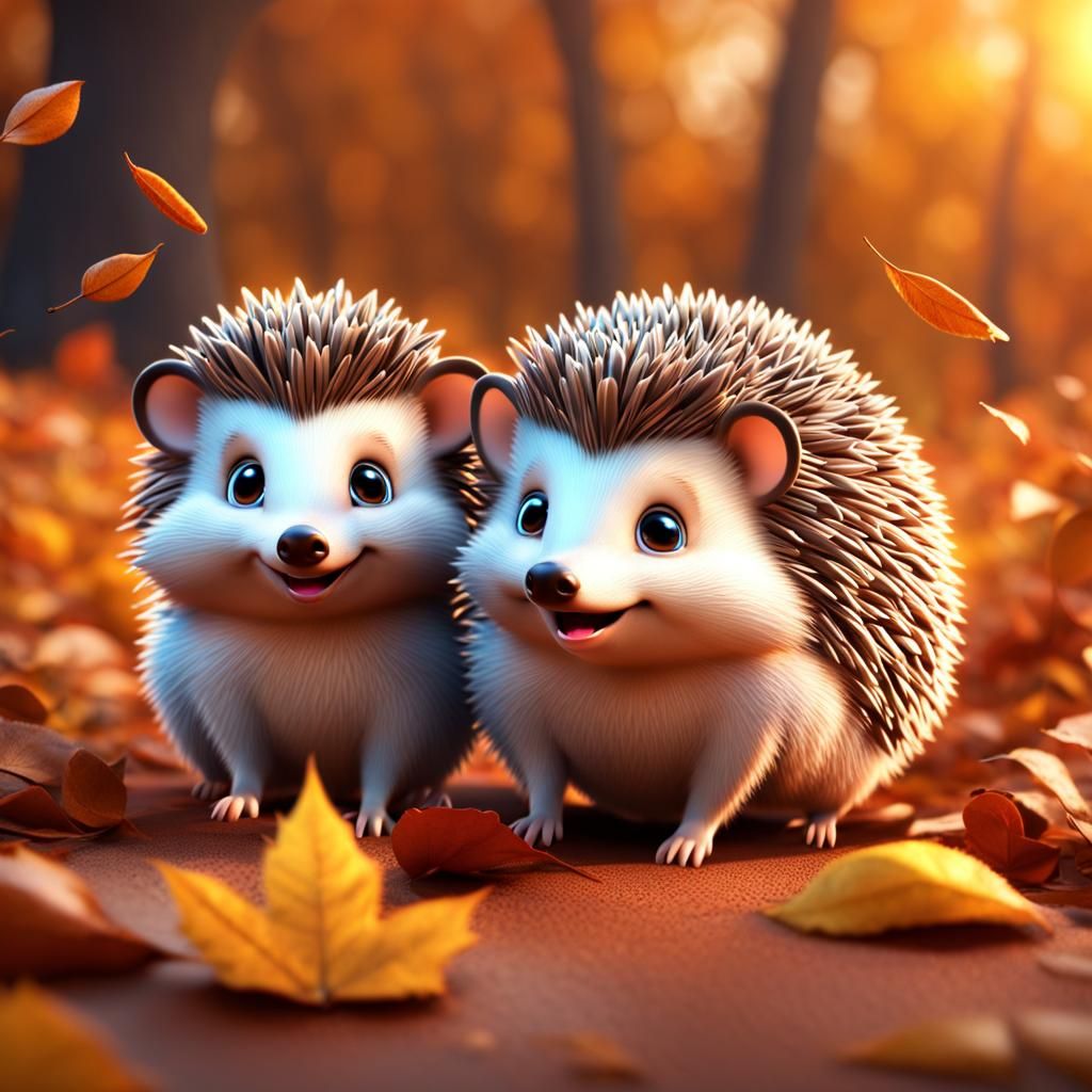 Two cute happy baby hedgehogs in brown autumn leaves Pixar, Disney, concept art, 3d digital art, Maya 3D, ZBrush Central 3D shading, bright colored background, radial gradient background, cinematic, Reimagined by industrial light and magic, 4k resolution post processing