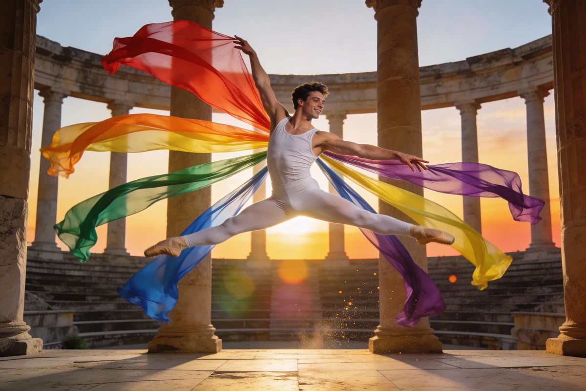 This image captures a joyful male ballet dancer mid-leap, with vibrant silk scarves streaming behind him like wings against a sunset sky in an ancient amphitheater.