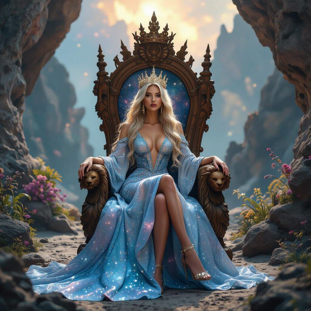 This image shows a majestic woman with starlight hair and a gown of galaxies, seated on a throne amidst alien flora. The artwork blends bold fashion with cosmic fantasy and vibrant colors.