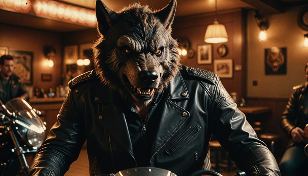 This image shows a werewolf dressed in motorcycle leathers inside a biker bar. The cinematic shot captures the scene's warm, smoky atmosphere with golden hour lighting and a grainy, film-like texture.